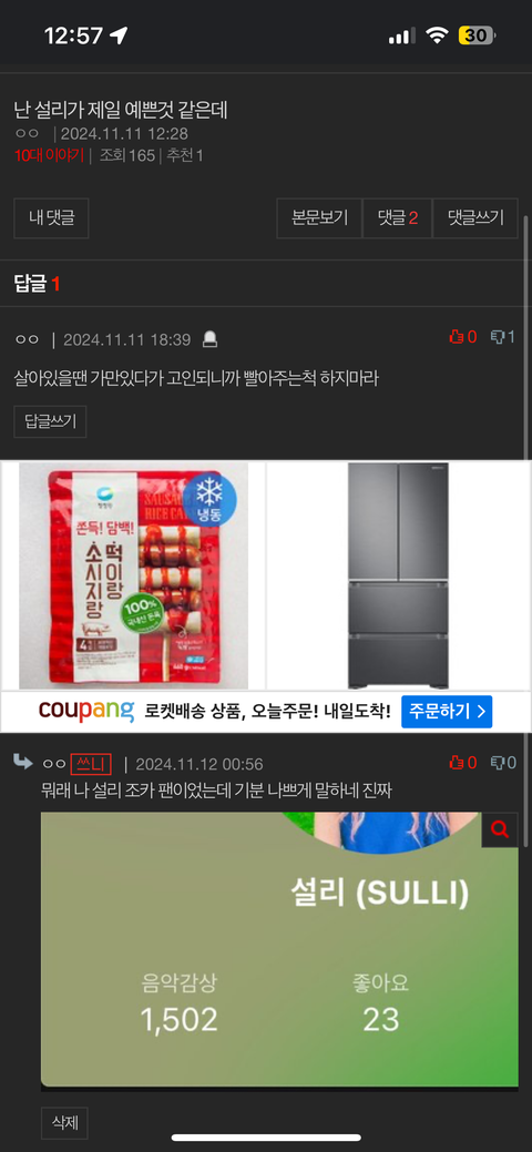 난 설리 진심으로 좋아했는데 이딴식으로 말하는거 진짜 싫음 아니 이쁘다고 했다고 왜저럼