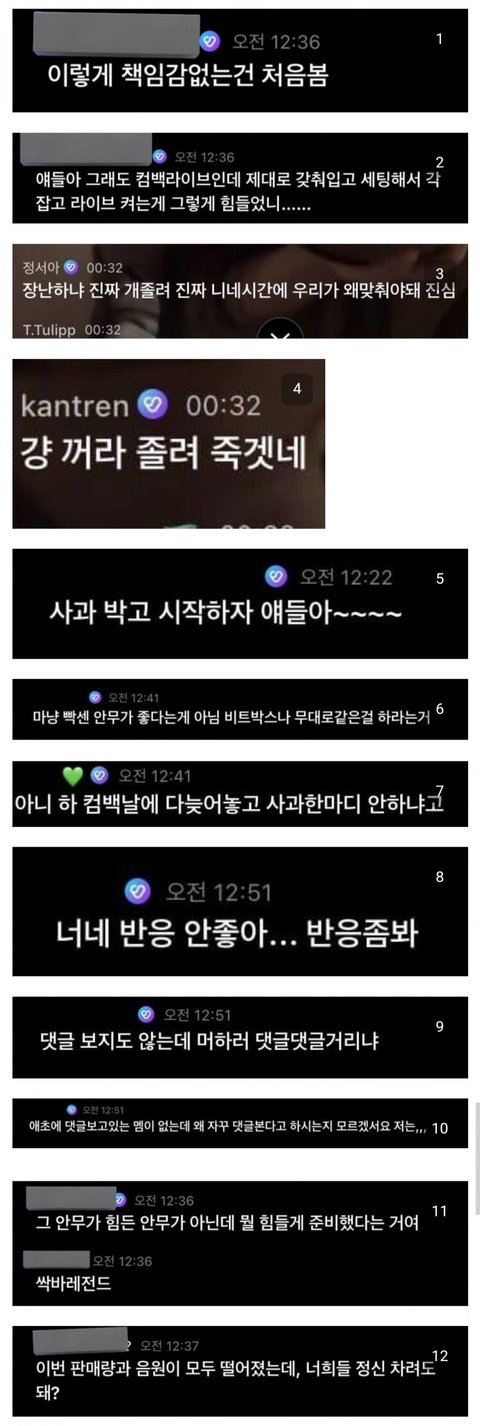 근데 늦게온거 미안하다고 라방 시작할 때 사과하라고 댓단건 아무리봐도 잘못된 댓글인지 모르겠음 이 정도 댓글에도 애들 상처 받는다고 남기지말라 하면 멘탈 약해서 연예인 커함