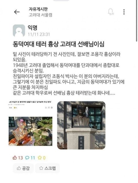평생을 여성교육에 힘쓰고 즈그대학 종합대로 승격시켜준 조용각 흉상에 테러하는 멍청한 행태