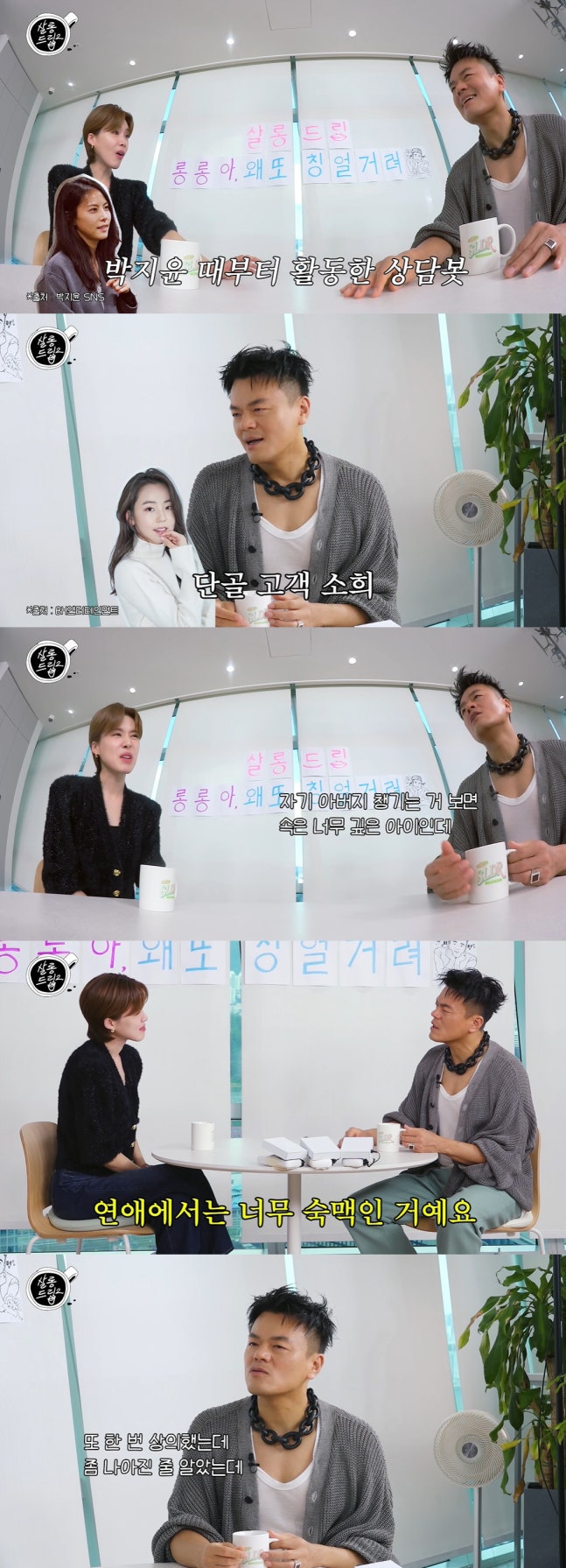 그런 박진영이기에 소속 가수들이 연애 상담도 요청하는 편이라고. 박진영은 "박지윤 때부터 했다. 비와 김태희가 교제할 때도 비가 저랑 상담했다. 저는 완전 몰입해서 듣는다. 특히 소희가 걱정되는 리스트 중 하나다"라며 아버지 마음으로 말해 웃음을 안겼다. 이어 "소희가 아빠를 챙기는 걸 보면 속이 너무 깊은 아이인데 연애에서는 너무 숙맥이다. 못된 애가 못되게 해도 잘 모른다. 얼마 전에 상의했는데 나아지지 않았다"라며 걱정했다.이게은(joyjoy90@sportschosun.com)