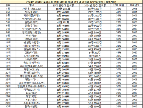 2024년 네이버에서 20대들이 가장 많이 검색한 보이그룹 멤버 순위