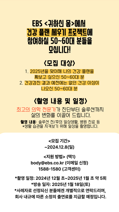 EBS <귀하신 몸>에서 2025년 '건강 플랜 세우기 프로젝트'에 참여하실 50~60대 분들을 모십니다!