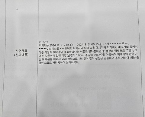 당시 신고 현장에서는 칼이 뽑혀있는 상태였고 구급차에 실려 올때부터 피해자는 심정지 상태였다고 합니다. 응급실에 이송 후 심페소생술은 3시간 정도 진행되었습니다.