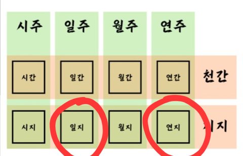 지지에 사화(가장 오른쪽 아래 글자인 빨간색 뱀)글자가 있으면