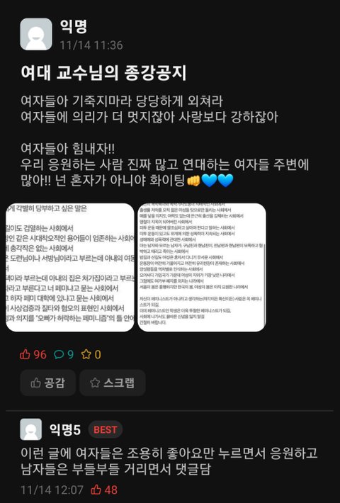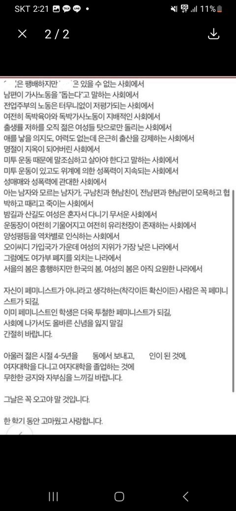 충분히 입장이해 가능한데 이걸 빌미삼아 다시 페미니즘이 또 부약하고 있는데 동덕여대사건이랑 페미니즘사상은 근본적으로 다른 문제임