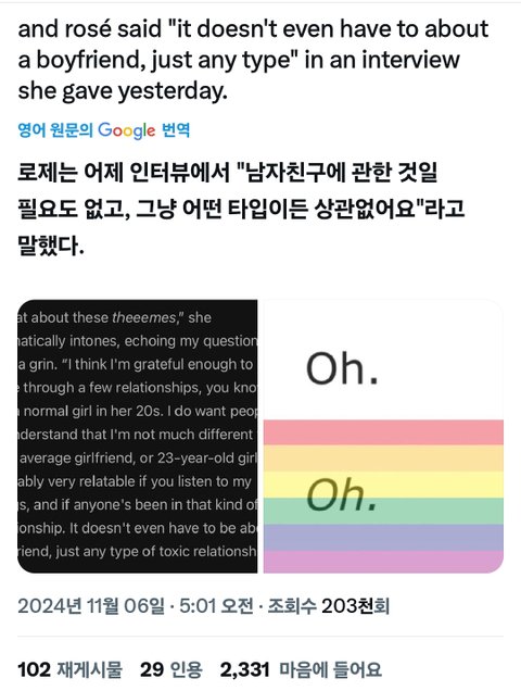 연애라고 단정 짓진 않겠지만 솔직히 남돌 여돌 할거 없이 아이돌이라고 연애 안할거라 생각하고 그런 이미지로 생각하고 파는게 더 기괴함 무슨 렌탈 연인 사업하는것도 아니고 저렇게 본인 경험 솔직히 말해주면서 노래에 녹여내는게 더 좋음 로제 이전 정규앨범도 넘 기대된다
