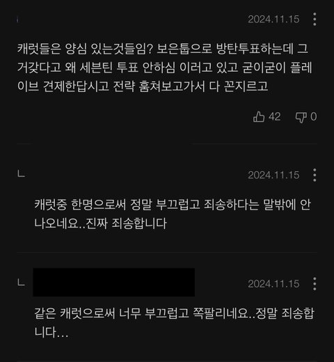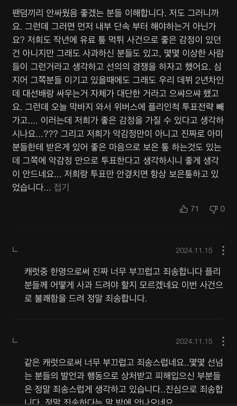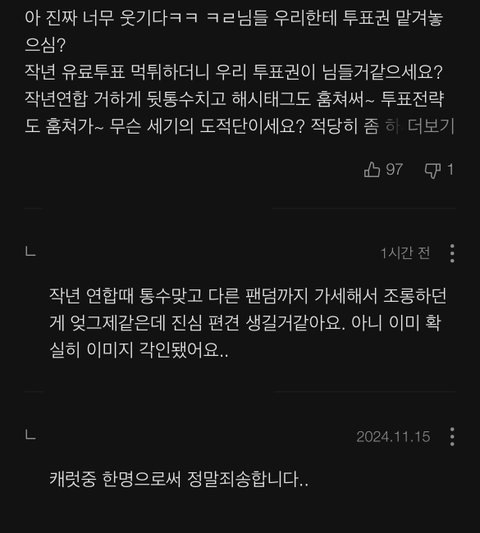 주간인기상 댓글 죽창나서 구경하는데 투표 밀린다고 캐럿들이 위버스 위장가입해서 투표 전략 훔쳐서 공유했다고 함그것때문에 보복으로 다른 아티스트 투표하는거라고 분탕몰이 하는거 같던데 쟤네는 작년에도 통수치더니 올해도 같은 팬덤한테 통수치네