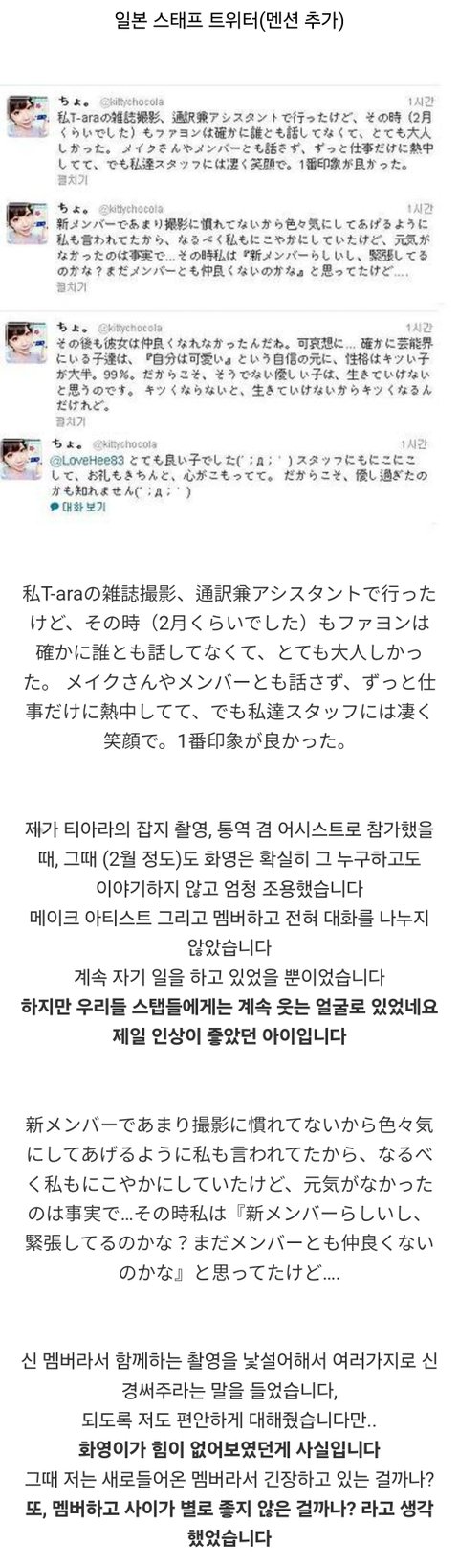 그는 "이미 알려져 있듯이, 멤버들이 트위터에 '의지의 차이', '천재에게 박수를 드려요'라고 똑같이 올려서 한 사람(화영)을 저격했던 일도 있다. 괴롭힘이라는 게 꼭 육체적인 것만 해당하는 것은 아니잖나. 화영이가 멤버들의 괴롭힘으로 인해 고민을 굉장히 많이 했고, 티아라를 그만두고 싶다고 토로하기도 했다"라고 증언했다.