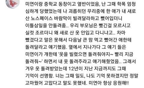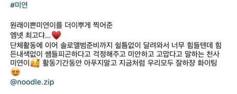 미담들(아래 사진들)....이외에도 패션쇼때 모델분들이랑 사진찍는데 다 정색하고 찍는 와중에 미연이가 포즈 취하면서 분위기 푸니까 다 활짝 웃었음. 미연이가 양손 들면서 모델분들 가리키고있는 포즈취하니까 모델분들 미연이 손위에 얼굴 올리고 웃거나 미연이 똑같이 가리킴...여기서만 봐도 인성을 알수있지만 미연 무인도라고 유튜브에 치면 영상 나오는데 거기에도 댓글에 초딩동창이 미연이 초딩때부터 유쾌하고 재밌는 좋은 친구였다고 그러더라...게다가 현아도 미연이 성격이 좋다고 언급하고 미연 주변 사람들만 봐도 사나,츄,윈터같은 순한 사람들임.