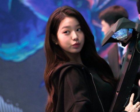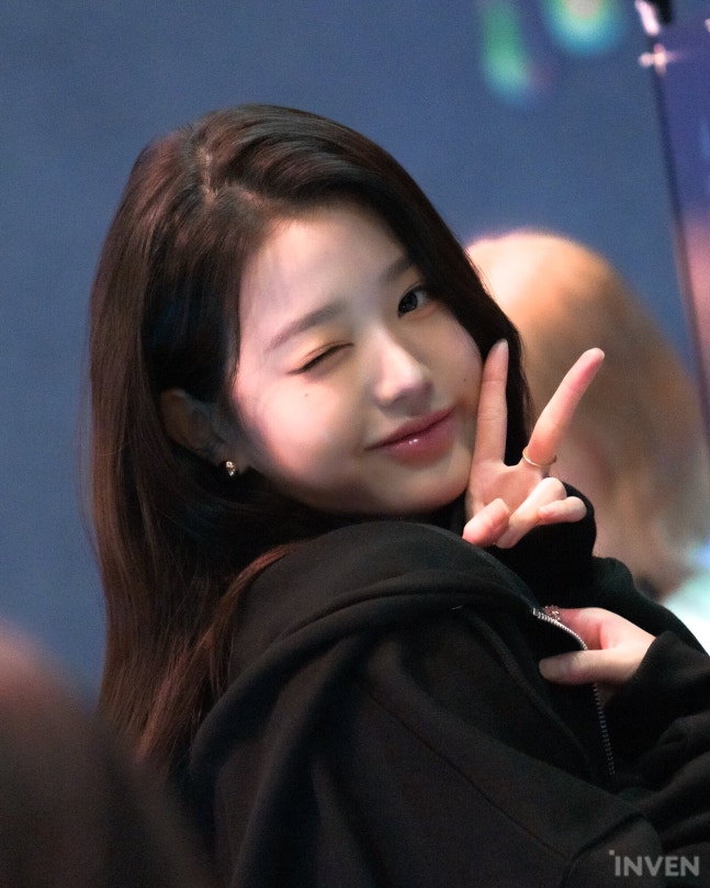 16일 2024 지스타 제2전시장 키디아 게이밍 부스를 찾은 아이브의 장원영이 카메라를 향해 포즈를 취하고 있다.