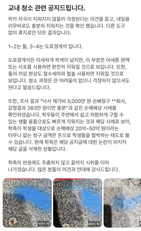 동덕여대 길티 1)대학에거 피해보상 청구한다니까 꼬리 내리고 복구 방법 찾음 길티 ㄹㅈㄷ.... 길티2)본문 저거 자세히 읽어보면 ‘사포로 긁어서 마커 자국 없앤다’ 하.... 능지 ㄹㅈㄷ.... 사포로 긁으니까 내 눈에 안 보이네? 그럼 복원된 거 아님? 이러면서 트위터에서 인용으로 지들끼리 서로 박수치고 칭찬하는 중... 사포로 긁는 게 어떻게 복원이냐고ㅋㅋㅋㅋㅋ... 표면 코팅이랑 다 갈리는데 하..ㅋㅋㅋㅋ 진짜 이번 동덕 사건으로 알게 된 게 페미는 모순이며 길티 그 자체다.