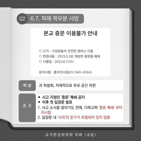 나는 2교시 숭인관 수업이어서 사건 발생 후 후문을 지나 해당 장소를 지나게 되었고 바닥에 핏자국과 사고 잔해들이 뒹구는 모습을 그대로 보았던 학우중 한명임 같은 수업을 들은 친구중에는 1교시에 등교해서 실려가는 학우와 구급차도 보았고 한동안 계속 힘들어했음 해당 사건에 있었던 모든 일들을 날조로 치부하고 선동하지 말아주었으면 함 현재 시위를 폭력시위라고 생각하기 때문에 비난하고 있다면 해당 시위는 누구보다 처절했고 간절했던 그리고 지금 니네가 좋아하는 비폭력 촛불평화시위였음
