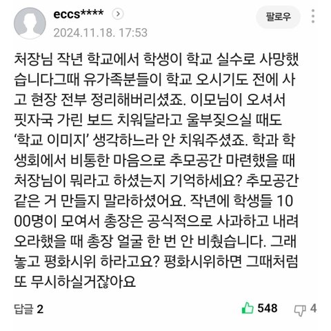 사건이 묻히길 바랐던 학교측은 발생장소의 분향소를 반대했으나 학생회와 유가족이 마련하였음 해당 진의여부는 당시 추모촛불시위 실명 발언에서 알 수 있음 궁금하면 찾아보셈 사건 발생 5일, 학우 사망 7일 학생회 분향소 마련 / 학교측은 다음날인가 다다음날 비판 여론이 생기고 본관 앞에 대자보가 붙자 대자보를 떼어버린 자리에 해당 분향소를 차림