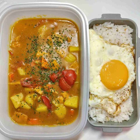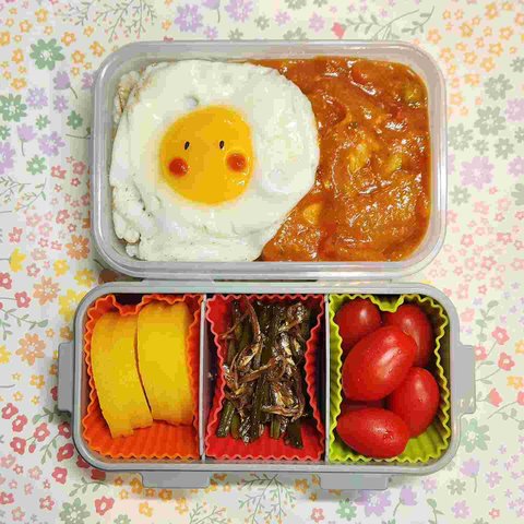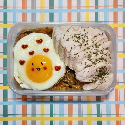계란후라이 (볼따구는 스리라차소스) / 닭가슴살토마토가레 / 꽈리고추멸치볶음 / 단무지 / 방토