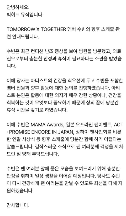 번아웃같은데 솔직히 수빈만 아픈거면 몰라 지금까지 멤버들 계속 고열에 급체에 코피에 상태 안좋은 징조 많았는데 이정도면 그냥 아예 휴식기를 길게 줘야되는거 아닌가 싶음…다음 컴백 준비고 뭐고 투어부터 시상식들까지 스케줄이ㅅㅂ말이아니잖아지금