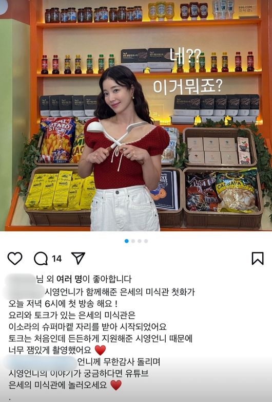 공개된 기은세의 게시물에는 “시영언니가 함께해준 ‘은세의 미식관’ 첫 화가 오늘 저녁 6시에 첫방송해요!”라며 “요리와 토크가 있는 은세의 미식관은 이소라의 슈퍼마켙 자리를 받아 시작되었어요”라며 “토크는 처음인데 든든하게 지원해준 시영언니 때문에 너무 잼있게 촬영했어요”라는 글이 담겨 있었다.
