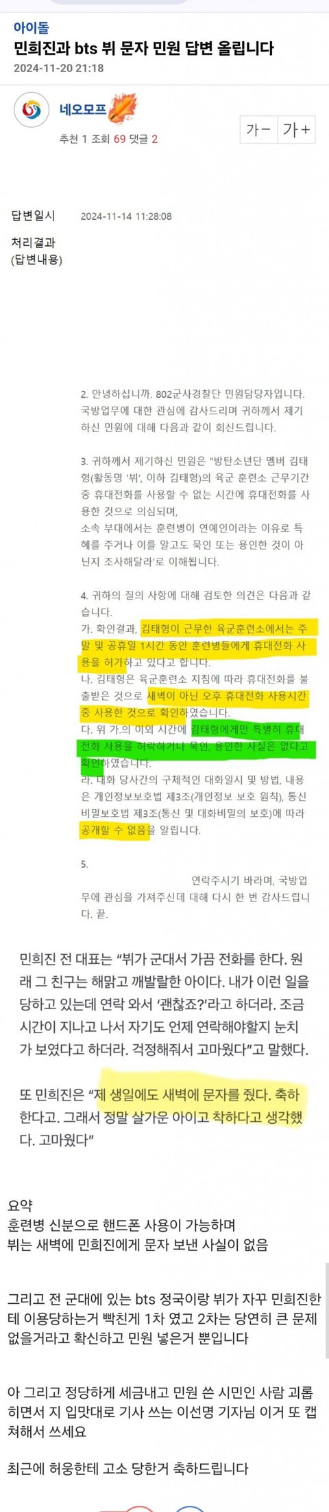 뷔 솔앨 작업을 했으니 둘이 친분있을 수 있음 뷔도 군대에서 특혜받은것 없음 아무도 잘못하거나 잘못된게 없는데 정신병자처럼 불확실한걸로 신고한게 제정신이 아님 이걸로 어그로 끄는건 합퀴들 밖에 없는데 뭐 어쩌라는걸까?