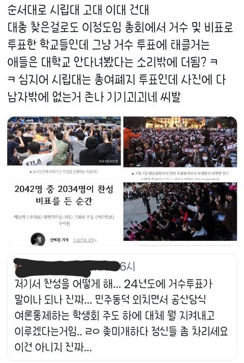 어이, 동덕도 그렇고 네가 예시들은 것도 그렇고 투표를 가장한 그냥 시위야. 애초에 안건에 부합하는 사람들만 모여서 피켓 항의 하는거라고. 54억 배상 떡밥이 나오니깐, 평화 시위 표방하는거고. 학교에서 행하는 공식 투표도 아닌데 그게 투표냐? 그런식이면 '54억 배상 해야한다.' 찬반 투표해봐' 찬성이 나오겠냐? 투표의 기본 원칙은 알고 있고?