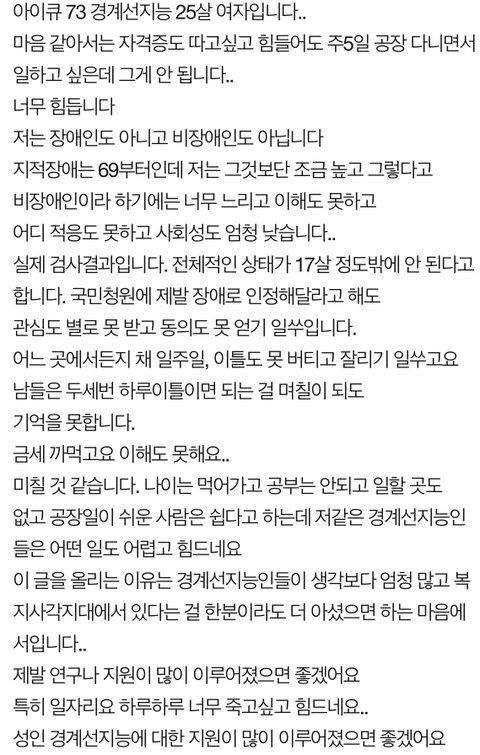 우리 아들이 5살때인가 소아정신과에서 경계선지능 판정을 받았네요. 성인이 되더라도 초5 정도의 지능이라 지적인 능력이 필요한 직업은 갖기가 어렵다. 다만, 생산직 같은 단순 직업을 가지고 가정을 꾸리고 살아가는 데는 문제가 없다...청천벽력 같았죠. 중학교때 까지는 사회성이 부족해서 친구가 거의 없다시피, 공고 다니면서 극소수의 친구, 전문대를 다니면서 몇몇이 생기는 정도이지만 그래도 많이 나아 지더군요. 고등학교떄 군대 갈 날이 얼마 남지 않았는데 관심사병으로 화장실에서 전투화 끈 풀지 않을지 아버지로서 심히 걱정이 되어 차라리 장애 판정이라도 받을 수 있다면 군면제가 가능하지 않을까 싶어 구립 청소년센터에서 검사를 받아 봤네요. 2천개 가까웠던 거로 기억하는데 온갖족이 각자 검사지를 작성해서 판정을 받았는데 여전히 경계선 지능이고, 장애 판정은 절대 불가능 다만, 부모님 특히 엄마가 아이를 너무 잘 키워서 심리상태와 사회성이 경계선지능에서는 최상이라고 칭찬을 하더군요. 아버지에 대한 존경심이 엄청나고 롤모델로 여긴다면서 공고를 지원할때 아버지인 저와 같은 업종의 전공을 선택한 것도 그런것 같더군요. 종종 본인이 이야기 하기도 합니다. "아버지처럼 전공 분야에서 최고가 되고, 회사에서도 인정바든 사람이 되겠습니다." 고등학교에서 국가기술자격증(기능사) 2개를 취득하고, 전문대도 진학을 했습니다. 학교를 휴학하고, 군대는 해병대를 다녀 왔네요. 자기가 자원 입대를 해서.... 산업기사 자격증을 따고, 지인을 통해 인턴생활도 몇달 하고 졸업한 뒤로 학점은행제로 학사까지 받았고, 최근에 지인 소개로 취업도 했습니다. 출근한지 얼마 안되었지만, 정말 성실하게 열심히 다니고 있습니다. 늘 근심과 우려로 바라보며 키웠지만, 아주 밝고 성실하게 살아 가니 기특합니다. 외국에서는 배우는 것, 학습이 느리다고 하여 slow learnner라고 합니다. 뭔가 일을 배우는게 느리지만, 특이하게도 이 사람들의 특징은 매우 긍정적이고 순수하며 성실하다는 것입니다. 그래서 글로벌 기업들은 일부러 일정 비율의 직원을 채용하여 적절한 부서에 배치를 하기도 한다고 합니다. 조직에 선한 영향력을 미친다고 보는 것이지요. 글 속에는 부모님과 성장 환경에 대한 내용이 없어서 뭐라 말 하기는 조심스럽지만, 글 쓴 님도 꿈과 희망을 가지고 차근차근 도전해 나가기를 기대합니다. 경계선 지능이 드러난 정확한 통계는 없지만 몇 십만명의 엄청난 숫자가 된다고 합니다. 우리 주변에 둘러 보면 주변인들이 알아차리지 못하는 경계선 지능인들과 어울려 살아가고 있는 겁니다. 너무 낙담과 좌절하지 않고 하고 싶은 일, 흥미를 느끼는 일을 찾아서 차근차근 도전해 가며 살아 가시기를 기원합니다.