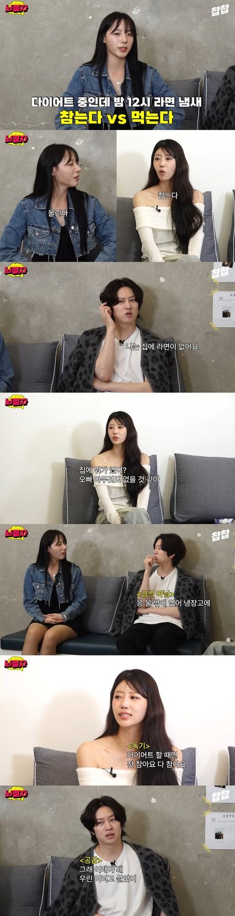 김희철은 "물밖에 없다"고 인정, 미주는 "생각해 보니 나도 음료수밖에 없다"고 알렸다. 이에 하지원은 미주에게 "라면을 참느냐. 다음날 촬영이 없어도 참느냐"고 반복해 물었다.