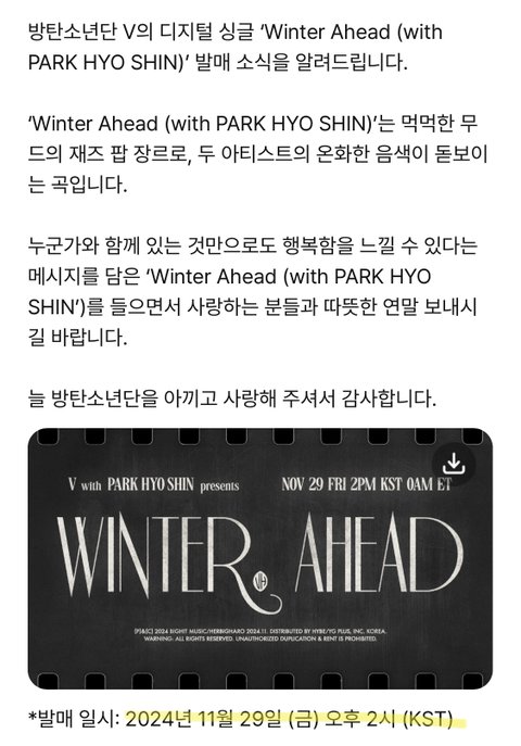 뷔 겨울에 캐롤 내준다해서 도키도키하게 기다리고 있었는데 방금 겨울 싱글 들고 오신다고 공지 뜸...