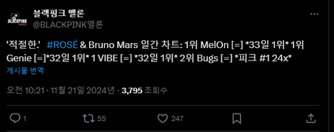 현재 에스파 팬들은 로제의 APT가 슈퍼노바를 제치고 PAK를 달성하지 못하도록 방해하고 있어요.