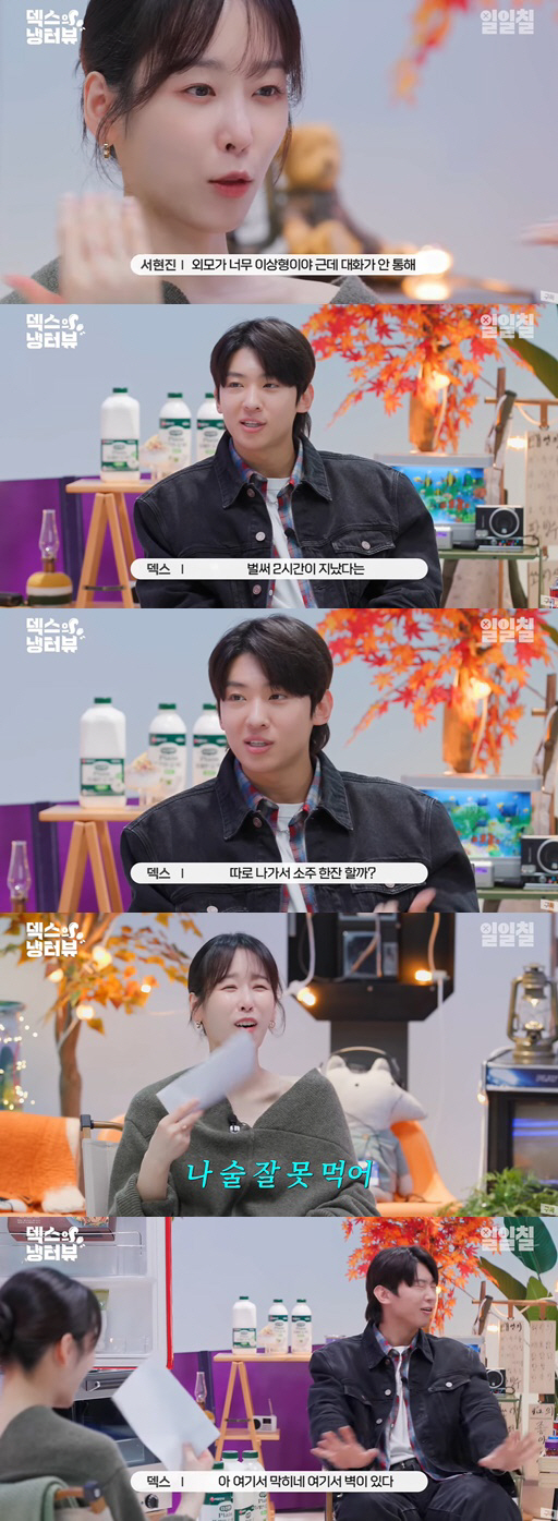 또 서현진은 "외모보다도 나와 대화가 잘 통하는 사람이어야 한다"고 이상형에 대해 밝혔다. 이에 덱스는 "우리는 대화가 잘 통하는 것 같다. 벌써 녹화한지 2시간이나 지났다"고 말했고, 서현진은 놀라며 "벌써 2시간이나 됐느냐. 제작진들 빨리 퇴근시켜드려야지"라고 답했다.그러자 덱스는 서현진에게 "그러면 우리 따로 나가서 소주 한 잔 할까?"라고 은근히 플러팅을 했고, 이에 서현진은 "내가 술을 잘 못한다"면서도 "이상형을 정리해 보면 너지 뭐"라고 너스레를 떨어 시청자들을 설레게 만들었다.