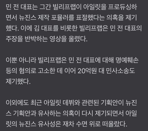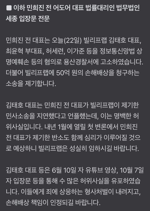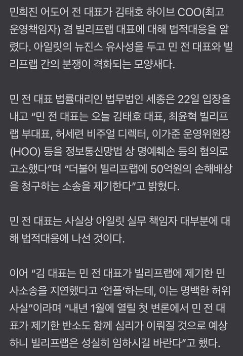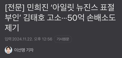 [전문] 민희진 ‘아일릿 뉴진스 표절 부인’ 김태호 고소···50억 손배소도 제기