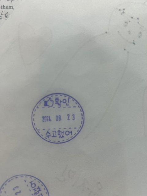 제발 도와주세요 의대목표인 고등학생인데 수행평가로 프린트물 제출인데 도장 찍힌걸 내야 점수가 인정되는데 선생님이 그거를 수행평가 기간에 알려주셔샤 제가 그거를 모르고 1학기때 버렸어요 그래서 선생님이랑 똑같은 도장 사서 찍으려는데 밤새 찾고 오늘 몇시간동안 찾았는데 도무지 똑같은게 보이지가 않아요ㅠㅠ 수행평가에 반영이 엄청 되는거라고 하는데 이거 만점 못벋으면 1등급이 불분명합니다 나쁜짓인거압니다ㅠㅠㅠㅠㅠ 하나 찾았긴한데 파란색이라 티날거같고 제발 도와주세요ㅠㅠㅠ 찾아주게요ㅠㅠㅠ