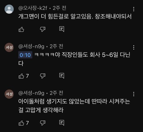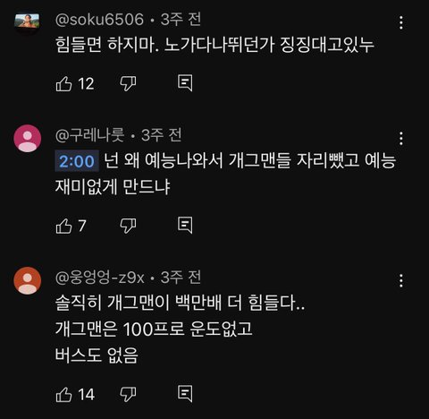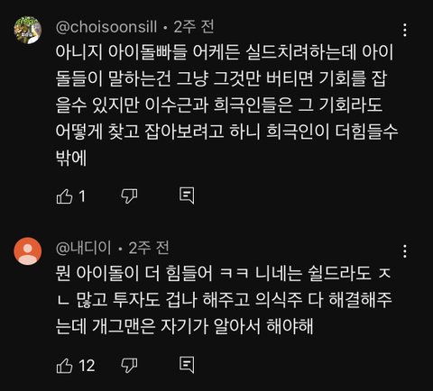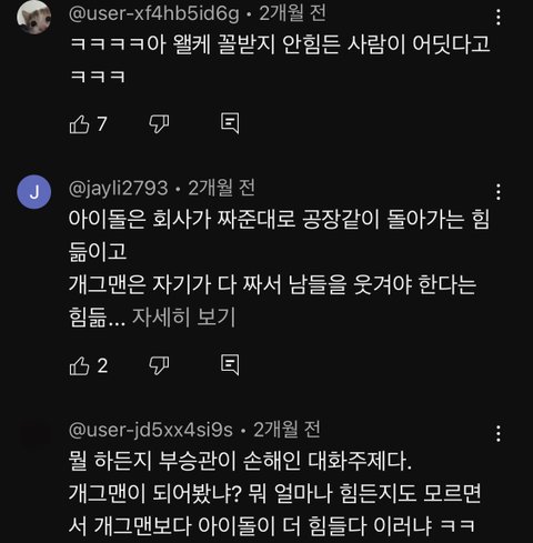 이수근이 분위기 잘 풀어나가서 반박도 제대로 안했을텐데 내가 보면서 부승관한테 반박해보자면 / 1. 일하면 너네 혼자 정산받잖아 우리는 소속사 어느정도 준 다음에 13명이 나눠갖는다 - 개그맨이 혼자서 버는 것보다 크루 단위로 움직이는 것도 엔빵 정산하는데 뭔 소리임 그리고 세븐틴이 만약 4인조면 4명이서 나눠갖는다 이런 소리하면 개짜치는 건데 본인팀 멤버 많은 걸 왜 아이돌 힘든 거에 투영을 함 / 2. 너넨 개그만 잘하면 되잖아? 우린 다 잘해야 해 - 이건 부승관이 개그맨에 대한 직업을 평가절하하는 거임 요즘 3세대 이후로 아이돌한테 요구하는 게 많은 건 사실이긴 하지만 마찬가지로 개그맨도 할 거 많음 개그말고도 분장, 대사짜기, 연출, 조명, 음악준비 등등 / 3. 우린 일주일에 5일을 녹화해 - 그것도 컴백 기간에만 해당되는 거고 일 자체가 주어지지 않는 잊혀진 개그맨들 수두룩함 설령 아이돌도 마찬가지임 그리고 직장인들은 컴백 그딴 거 없이 휴가 제외 평생 일주일에 5일 일하는데 뭐가 문제? / 4. 우린 아는형님 나오는 것도 큰 부담이야 - 아는형님 나오는게 아이돌 본분도 아닌데 꼬우면 안나오면 그만임.. / 그거 말고도 부승관은 이수근이 아는 개그맨 10명 대보라 했을 때 말도 못 했고 이게 현실임 이수근이 아이돌 자격으로 아는형님 나가는게 회사로서 엄청 큰 부담을 갖고 나가는 거라 징징댈 거면 나오지말라 라고 했다면 분위기 곱창날 거 뻔하니까 개그맨들도 음악방송 나가고 싶어도 못나가는 애들 많다 라고 재밌게 풀었는데 감정 컨트롤 못하고 그 자리에서 화내면서 아니 왜 나가고싶어? 이럼 김준현이랑 홍현희가 계속 콩트치면서 분위기 풀어주는데 그때도 헛웃음치고 마지막에 아이돌이 더 힘들다니까!! ㅠㅠ 이러는게 너무 길티임 근데 부승관 팬들은 저 영상 눈막귀막하잖오..
