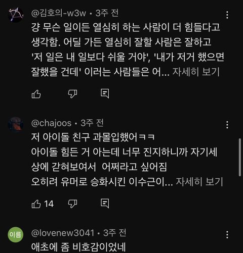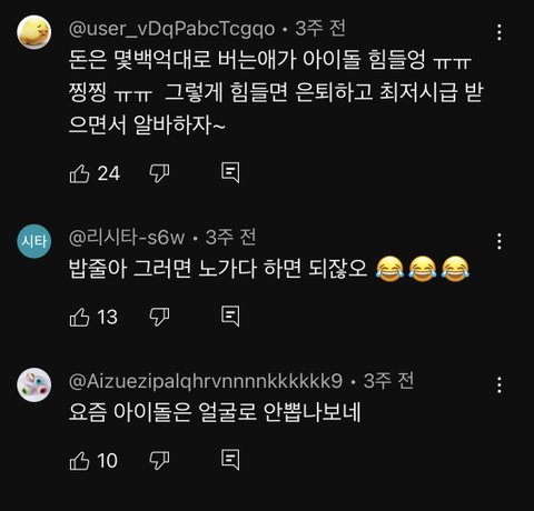 아이돌 금기어 : 아이돌 너무 힘들어요 ㅋㅋㅋㅋㅋㅋㅋㅋㅋㅋㅋㅋㅋㅋㅋㅋㅅㅂ진짜 그런 말은 니들끼리 사석에서 하세요;;;; 저런거 볼때마다 진짜 개짜침 프로의식 어디로 간 건지 1도 모르겠음 수험생도 힘들고 직장인들도 힘들고 요즘 세상 사는 사람들 중에 안 힘든 사람이 어디에 있음? 진짜 저뭔씹 어쩌라고 ㅋㅋㅋㅋㅋ 팬들 소통창구에서나 찡찡거리든가
