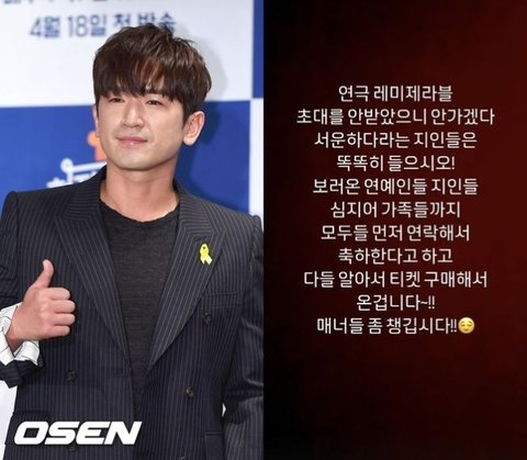 보러온 연예인들, 지인들, 심지어 가족들까지 모두들 먼저 연락해서 축하한다고 하고 다들 알아서 티켓 구매해서 온 겁니다. 매너들 좀 챙깁시다.