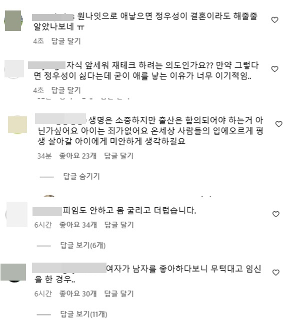 /사진=문가비 SNS 계정 댓글정우성 문가비의 혼외자 출산 소식은 대중에 충격을 전했다. 대한민국을 대표하는 최고의 미남 배우임에도 50세가 넘도록 결혼하지 않고, 과거 이지아와의 열애 이후 열애도 없던 정우성이 동료 배우도, 혹은 교제하던 여성도 아닌 '몇 번' 만났다는 문가비와 사이에서 아들을 얻었다는 소식이 평소 그의 언행이나 행보와 매치 되지 않는다는 비난도 나오고 있다. 물론 배우로서의 삶과, 한 남자로서의 개인적인 삶을 동일선상에 놓고 볼 수야 없다. 다만 정우성이 아들을 낳았음에도 이를 숨겼다는 사실과, 임신 출산에도 결혼하지 않은 채 아이를 책임지겠다고 말하는 모습에서 평소의 정우성 답지 않다는 이야기가 나온다.