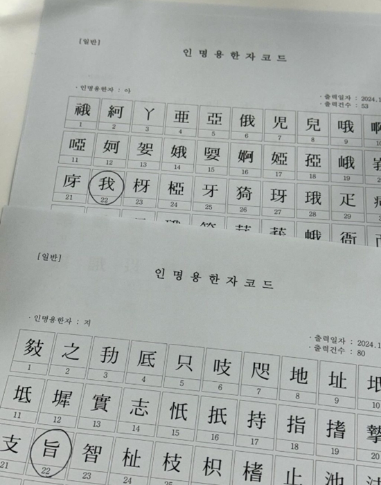 공개된 사진은 인명용 한자 코드 위로 홍진호가 특정 한자를 체크한 것. 딸의 이름을 구성하는 한자가 인명용 한자 코드에서 '22번'에 자리하고 있어 눈길을 끌었다.