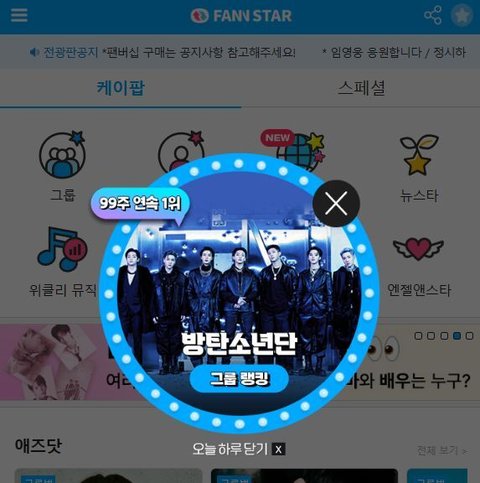 군백기에 팬앤스타 그룹 99주 연속 1위 함