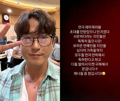 이민우는 지난 25일 자신의 인스타그램 스토리에 "연극 '레미제라블' 초대를 안 받았으니 '안 가겠다' '서운하다'라는 지인들은 똑똑히 들으시오!"라는 글을 게재했다.