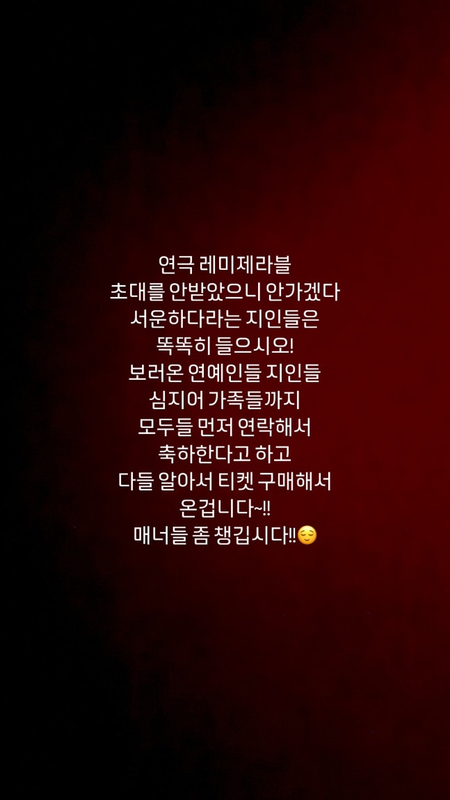 이어 "보러 온 연예인들, 지인들 심지어 가족들까지 모두들 먼저 연락해서 축하한다고 하고 다들 알아서 티켓 구매해서 온 것"이라며 "매너들 좀 챙기자"라고 일침을 가했다.