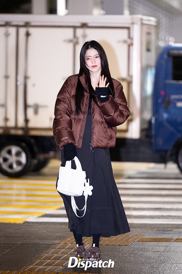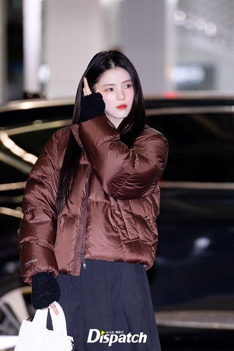 한소희는 블랙 스커트에 브라운 패딩으로 러블리한 공항패션을 연출했다. 인형같은 미모가 돋보였다.