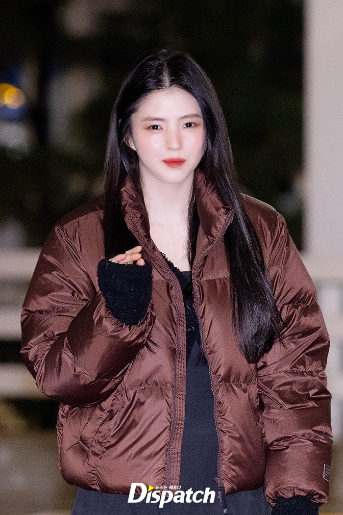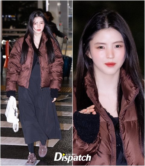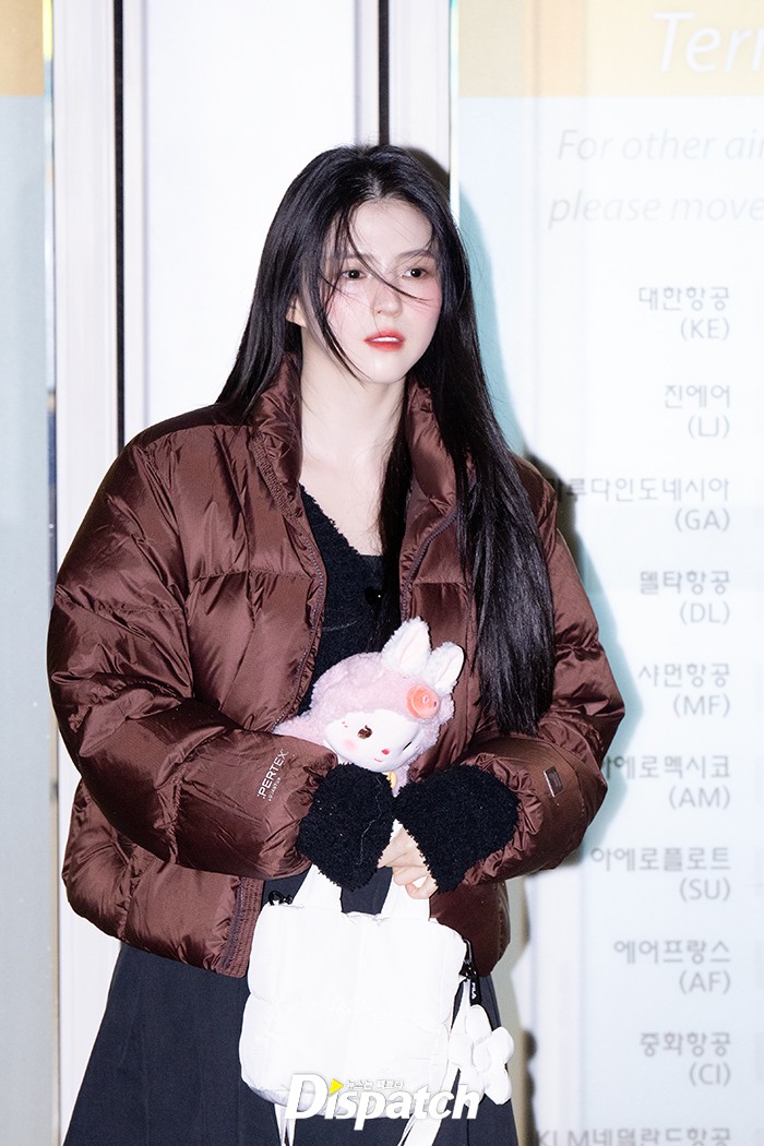한소희는 블랙 스커트에 브라운 패딩으로 러블리한 공항패션을 연출했다. 인형같은 미모가 돋보였다.