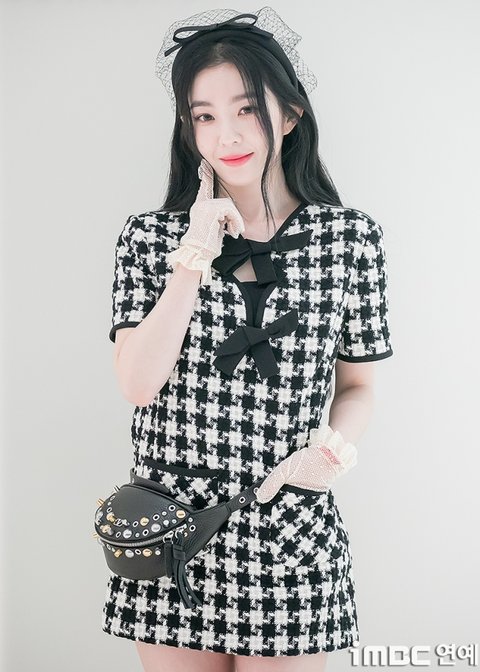 이날 아이린은 블랙과 화이트의 체크가 돋보인 원피스에 검정 삭스와 구두. 여기에 검정 가죽 백을 허리에 두르고 깔끔한 미니멀 룩을 뽐냈다. 특히 머리에 리본 머리띠와 레이스 화이트 장갑으로 우아한 공주님 패션을 완성하기도.