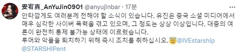 즁국 22만 아이브 팬계정이 안유진만 배척하고 안유진 영상만 안 올리고 5인지지한다더라 악플 달아도 관리도 안 하고 이게 맞냐 안유진 괴롭히는 짱개들 조직적임 빨리 조져라 스타쉽