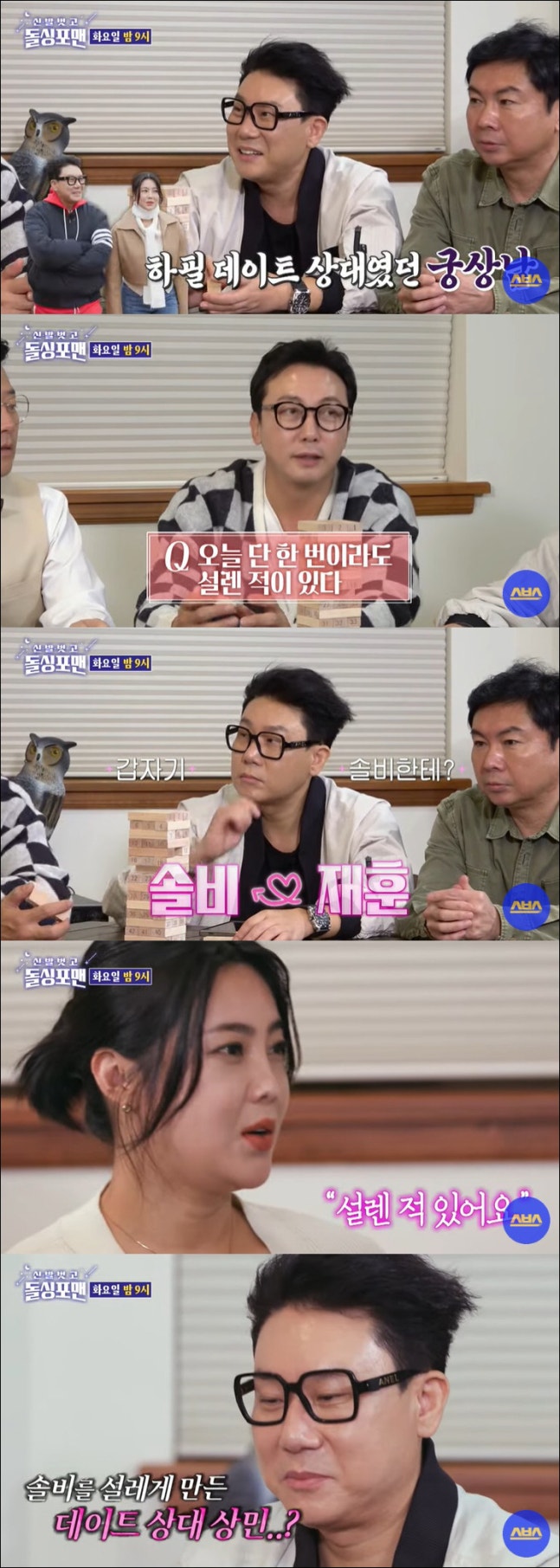 이어 탁재훈의 차례. 탁재훈은 솔비에게 "오늘 단 한 번이라도 설렌 적 있냐"고 질문했고 솔비는 "전 있다"고 솔직히 고백해 관심을 모았다.앞서 이상민과 데이트 한 솔비. 두 사람은 궁합 점수가 무려 90점이 나와 "결혼하는 거 아니냐"는 추측까지 받았다.