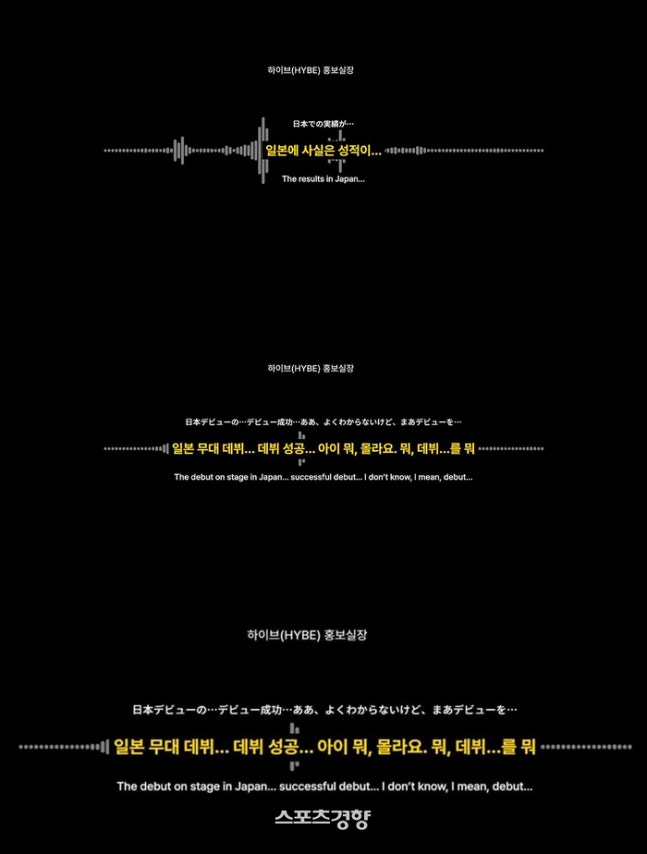 하이브는 당시 공개된 녹취 등을 반박했다. 하이브는 “기업 PR 담당자로서 뉴진스 성과를 부정적으로 말할 이유가 전혀 없다”며 “잘못된 정보를 그대로 두면 시장과 투자자들에게 혼선을 줄 수 있어 정정 요청을 진행했다”고 했다.