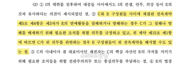 그러면서 “하이브 PR의 뉴진스 폄훼 발언 자체가 전속계약 위반이라고 볼 여지가 상당하다. 어도어는 쉐어드 서비스라는 이름으로 하이브 PR에 뉴진스의 홍보를 전담시키는 것으로 알려져 있다. 하이브 PR이 사실 상 어도어 PR로서 업무를 하는 것”이라며 “그렇다면 하이브 PR의 행위를 어도어의 전속계약 위반으로 볼 수 있는 것으로, 하이브 멀티레이블 체제의 문제점과 한계가 드러나는 대목이다. 하이브와 어도어가 별도 법인이라는 주장으로 회피할 수 있는 문제가 결코 아니다”고 했다.