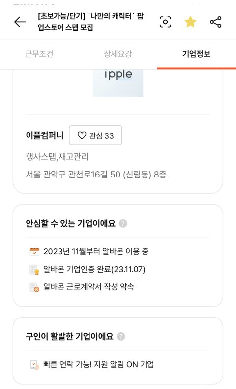 +++또 어디 팝업에서 문자왔는데 전화 가능하냐고 여긴 회사명이 나오긴 함. 근데 이 회사는 도매 기업이고(팝업과는 거리가 멂)시급도 너무 쎄서 수상함. 그리고 다른 곳과 달리 그 사이비처럼 전화를 유도함. 또 신림임;;;