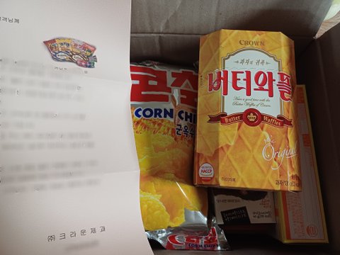 어쩌다 문의할 것이 생겨서 메일을 드렸더니 친절하고 자세한 답변과 함께 소중한 까까를 한가득 보내주신 크라운 정말 감사합니다 잘 먹을게요!! 다시 문의판에 메일을 쓰기엔 바쁘실 것 같아서 여기에 적어요ㅜ 앞으로도 자주 사먹고 응원하겠습니다:)
