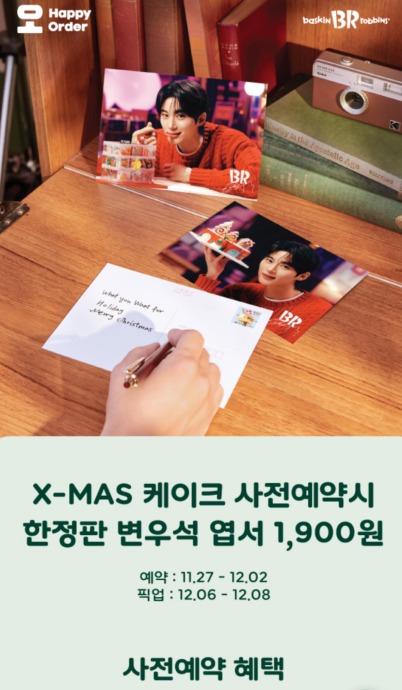 배라에서 크리스마스 케이크 사전예약 하는데한정판으로 실제 사용 가능한 변우석 엽서를 주더라고요통통이 저격용인가봄ㄷㄷ실제로 사용하지는 못하겠지만 소장욕구 미쳤…ㅠ