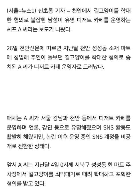 수사 결과 학대범은 서울과 천안에 지점이 있는 유명 디저트 카페 사장이랍니다. 강남점과 불당점이 있습니다.