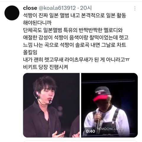 안 올려도 상관없음 근데 일곱강조하는 강성 올팬인걸로 아는데 어제오늘 태형 떡밥 알티한건 단 두 개임 사진조차 없음 본인이 올팬이라고 그렇게 피토하던데 이러면 안되는거 아닌가 본인이 안그랬으면 걍 없나보다 하고 말텐데 내가 이상한건가 싶어서 물어보려고 가져옴