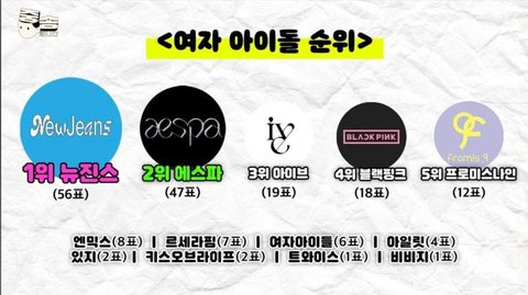 1위 뉴진스. 2위 에스파. 3위 아이브. 4위 블랙핑크. 5위 프로미스나인. 6위 엔믹스. 7위 르세라핌.
